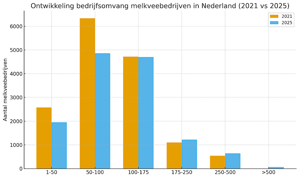 Maar ook hier vindt krimp plaats. In 2021 had nog ruim 89 procent van de melkveebedrijven minder dan 175 koeien; in 2025 is dat gedaald naar 85,6 procent. Het aantal bedrijven met meer dan 250 melkkoeien nam juist toe van ongeveer 540 bedrijven in 2021 naar ruim 700 in 2025.