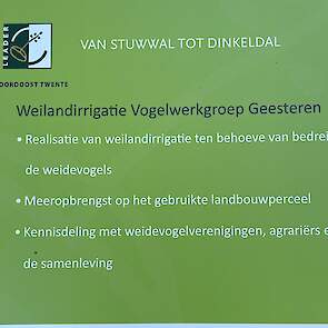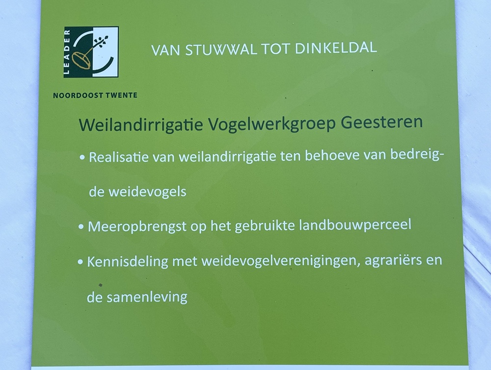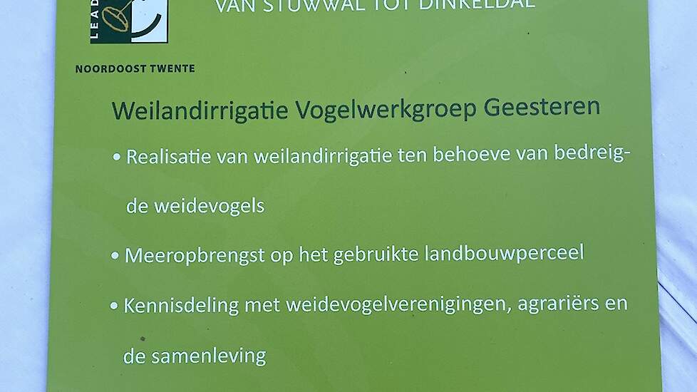 'Ruim 50 kilometer slangen druppelen vanaf het voorjaar van 2026 glashelder water voor een uitstekende oogst en een ideale biotoop voor weidevogels', meldt de Vogelwerkgroep. ‘Droogte door klimaatverandering maken het voor kuikens van de grutto's, kieviten en tureluurs steeds moeilijker om te overleven’, aldus de Vogelwerkgroep Geesteren. ‘Ze missen plekken waar voldoende voedsel als insecten voorkomen en vinden onvoldoende lage begroeiïng om in te kunnen vluchten voor roofvogels.’