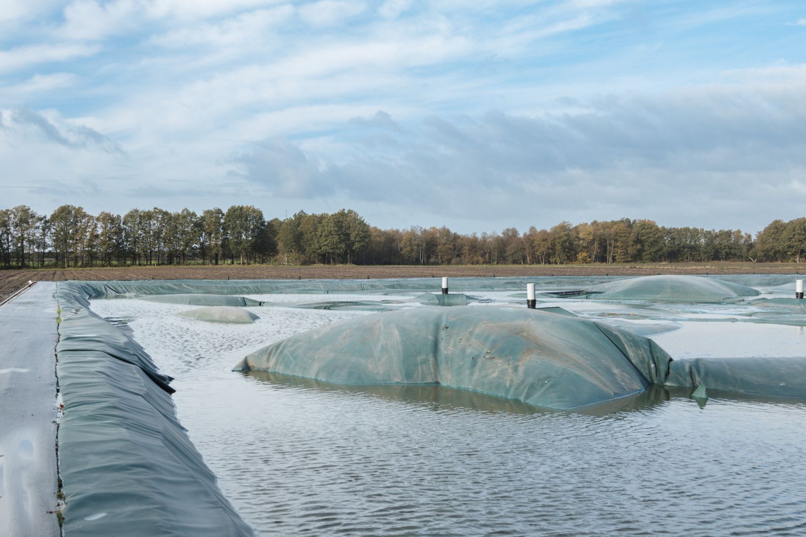 “Een opslag van 2.500 kuub is heel gebruikelijk,” vertelt adviseur Johan de Vries. “Maar we maken ze in iedere maat. Zo leveren we ook foliebassins van 500 tot 10.000 m³.” Johan legt uit hoe de constructie van het foliebassin in elkaar zit. “De aanleg begint met het ontgraven van het bassin. De diepte hangt af van het grondwaterpeil. Het bassin moet daarboven blijven. De grond die vrijkomt, wordt gebruikt om een stevige dijk rondom te vormen. Wij werken met een gesloten grondbalans zodat je geen extra grond hoeft aan te voeren. De dijk vormt de basisconstructie van het foliebassin en kan tot wel drie meter boven het maaiveld uitkomen. In de dijk wordt vervolgens KIWA-gecertificeerd mestfolie aangebracht: een onderkleed en een bovenkleed. Het bovenkleed bevat drijvers voor ontgassing. De dijk wordt afgewerkt met worteldoek voor een nette, duurzame uitstraling. Ook wordt er een hekwerk om het bassin geplaatst. Zo ontstaat een mestopslag die stevig, veilig en passend in het landschap is. Qua leidingwerk en mixmogelijkheden zijn er meerdere opties, dit wordt allemaal aangelegd in overleg met de klant. Ons systeem is volledig KIWA gecertificeerd.”