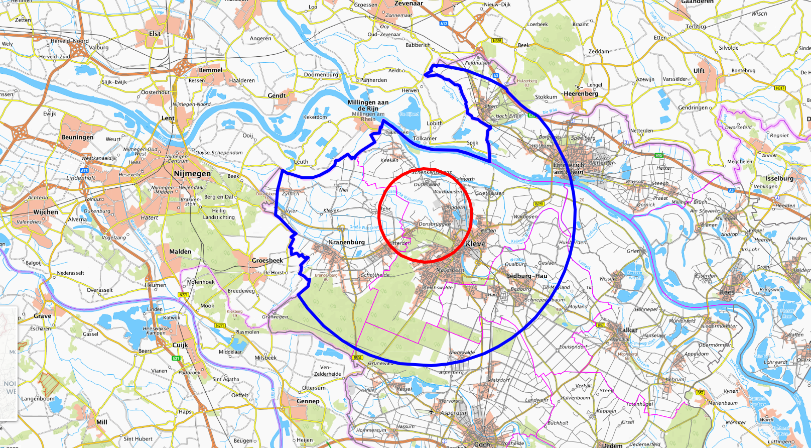 De Duitse autoriteiten hebben een beperkingszone van drie en tien kilometer ingesteld. De tien-kilometerzone grenst in het westen aan Groesbeek en Beek bij Nijmegen, ten noorden aan Leuth, Millingen aan den Rijn, Tolkamer en Aerdt. In het oosten doorkruist het gebied de grote plaats Emmerich. De besmetting is donderdag bevestigd door het Friedrich-Loeffler-Institut (FLI), het Duitse laboratorium.