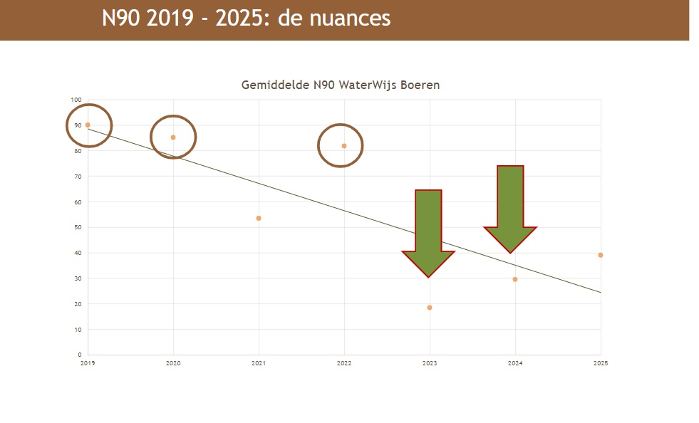 Van invloed op de N90-cijfers zijn onder andere de maatregelen van de deelnemers, het weer en de derogatie die in de grondwaterbeschermingsgebieden al sinds 2023 stopte.