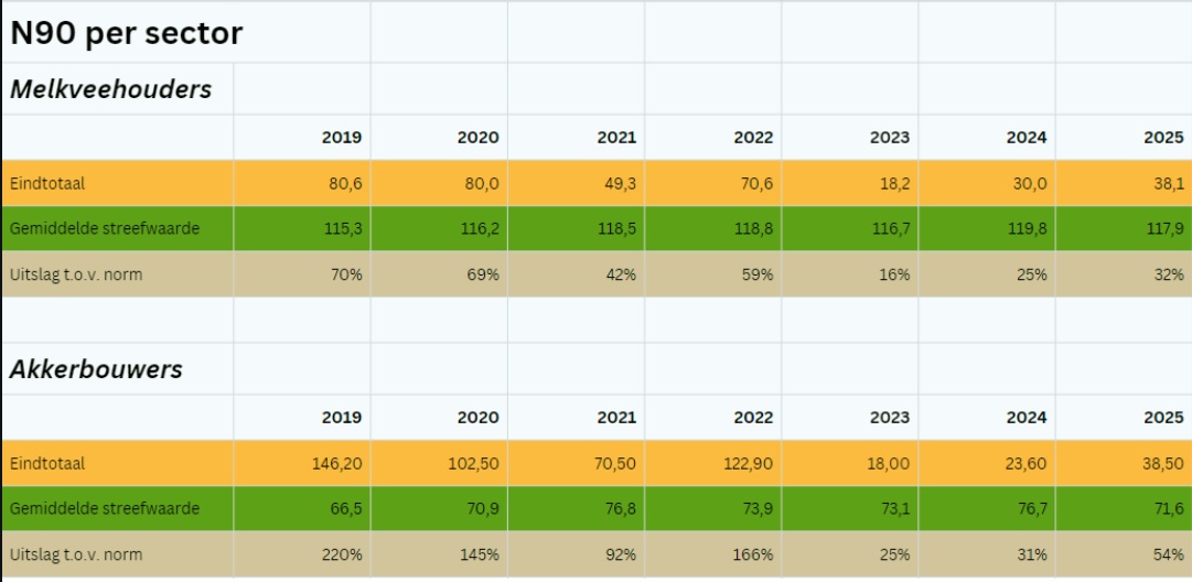Willemsen geeft aan dat in 2025 de N90-metingen voor het eerst in twee jaar weer goed zijn gelukt. ‘De voorgaande jaren was het tijdens het nemen van de monsters te nat en gaven de cijfers deels een vertekend beeld omdat de N90-monsters later in het jaar genomen werden. Het was in die jaren lastig te zeggen of de resultaten te verklaren waren door de maatregelen van de boeren of het tijdstip van bemonsteren.’