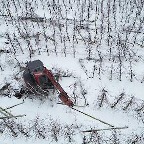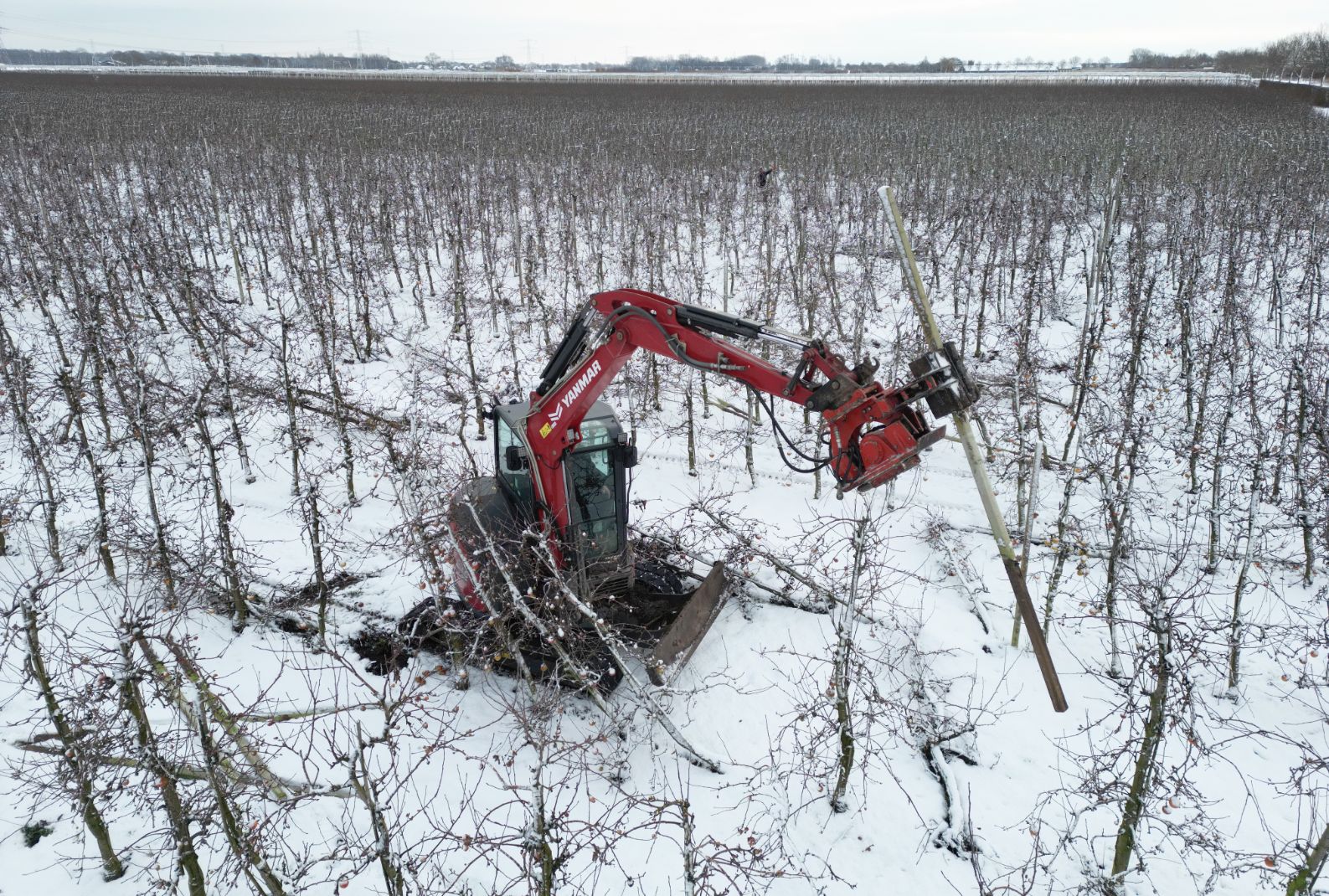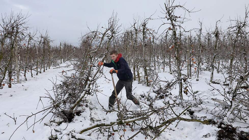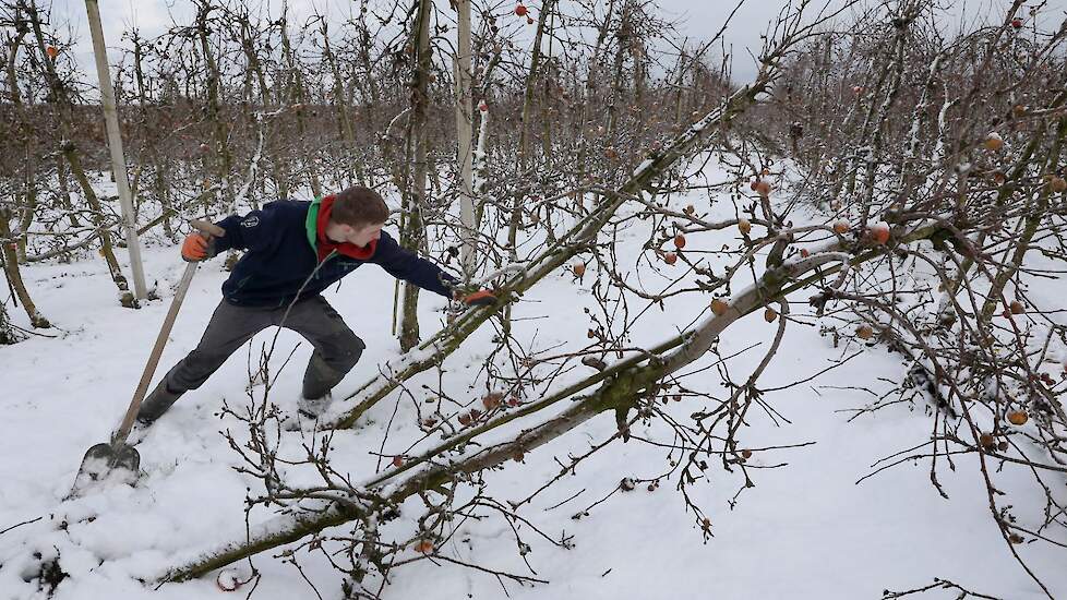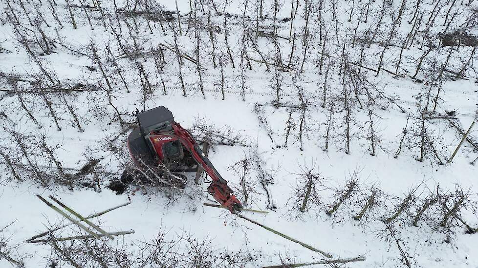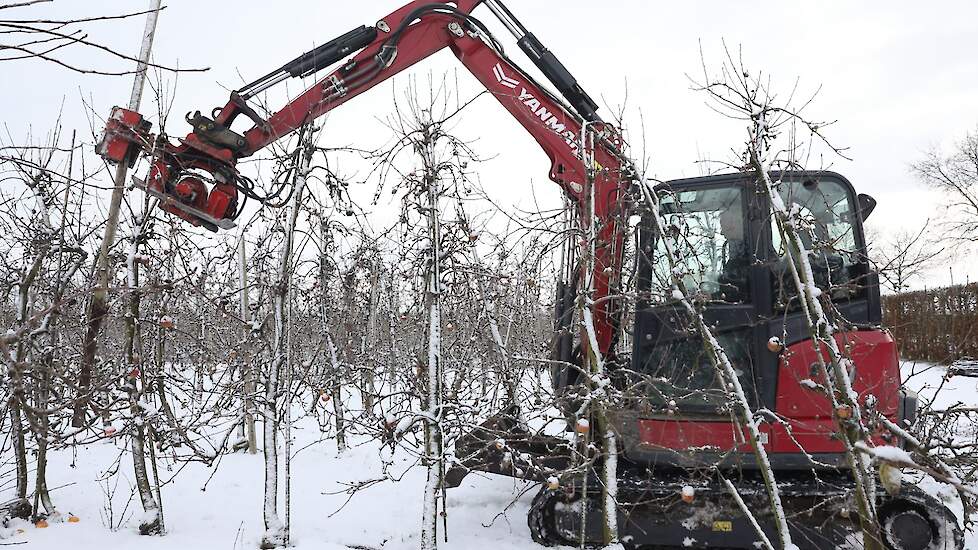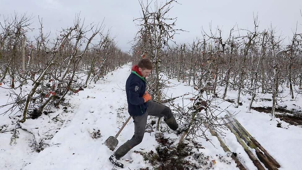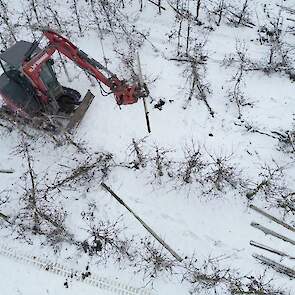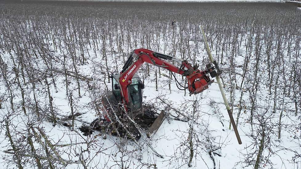 Loonwerker Hans van der Linden uit Eck en Wiel werkte maandag duizend betonnen palen tegen de grond. Deze week gaan ook de resterende 7500 appelbomen van het ras Wellant plat bij VreeFruit in Dodewaard (GD).