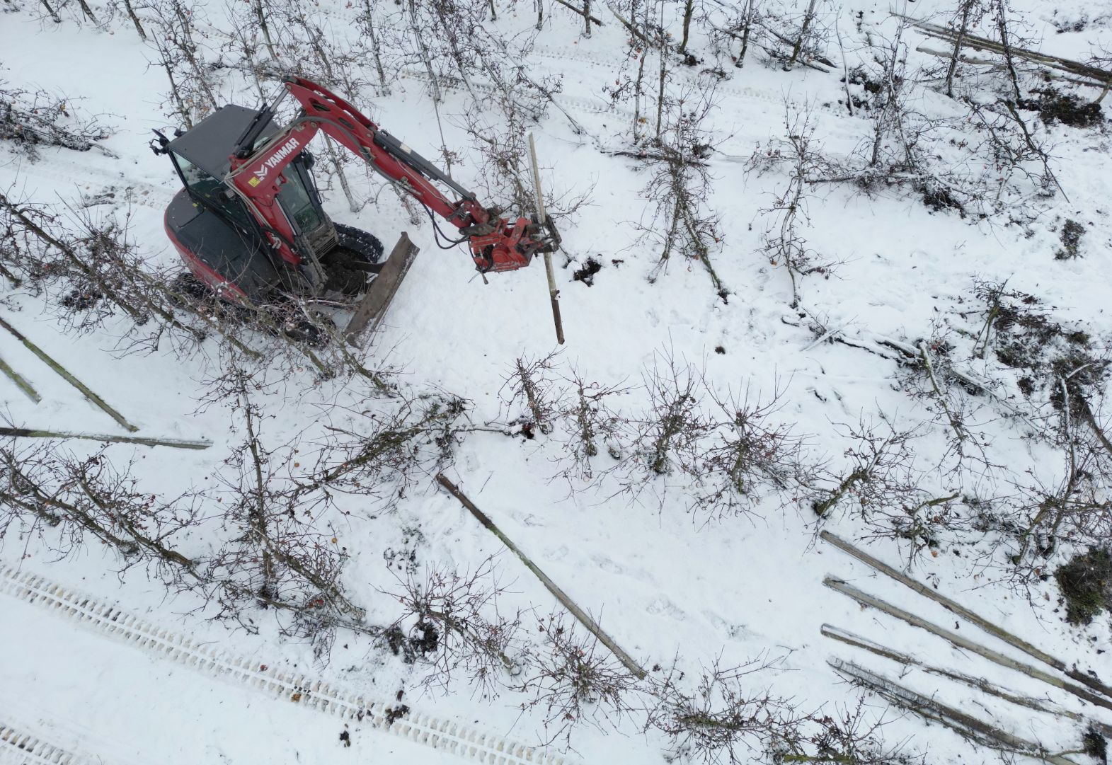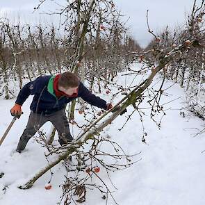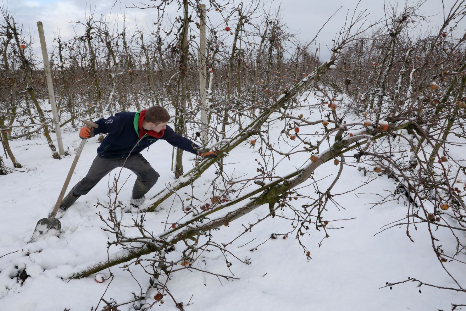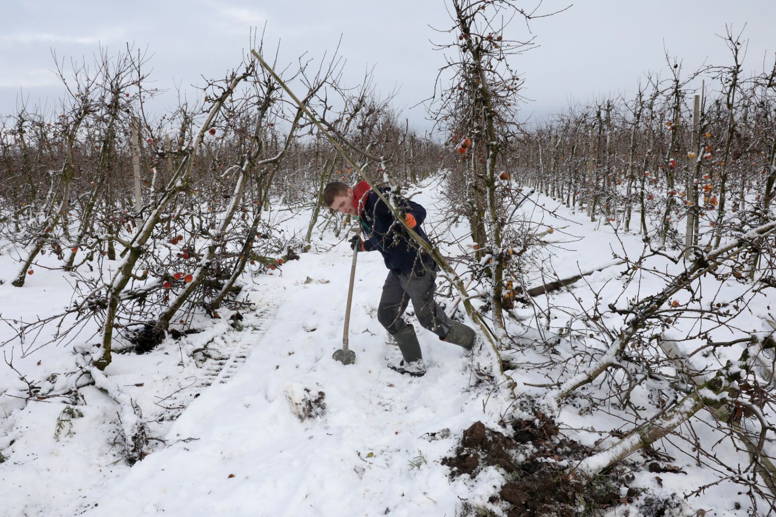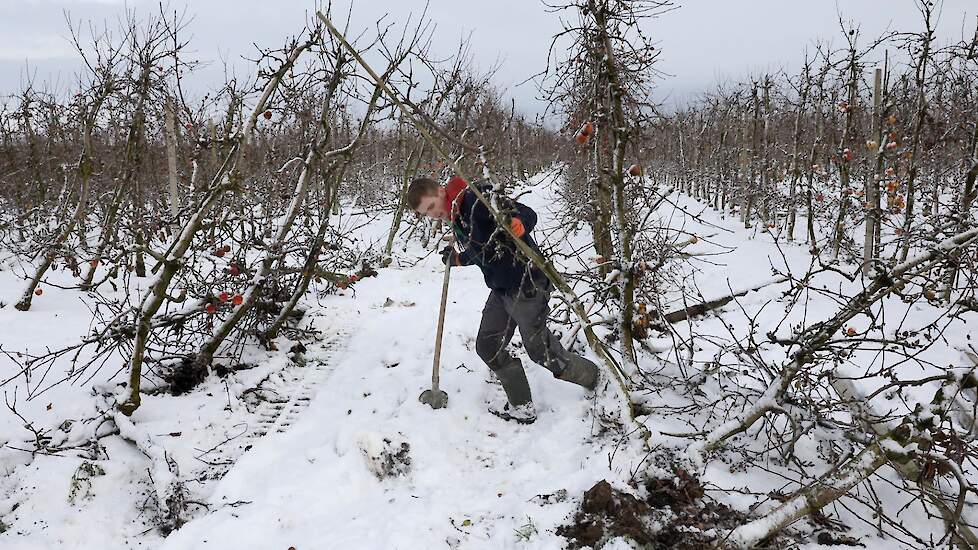 Fotoserie: Doorwerken in de sneeuw, loonwerker werkt duizend betonnen palen tegen de grond in boomgaard