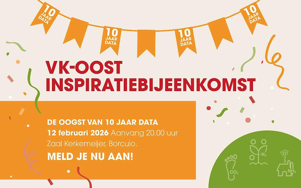 In het rapport 'De oogst van 10 jaar praktijkdata' is deze unieke database geanalyseerd op de thema's ammoniakemissie, CO2-uitstoot en stikstofbodemoverschot. Tijdens een feestelijke Inspiratiebijeenkomst op 12 februari presenteert VK-Oost de cijfers van 10 jaar werken met praktijkdata.