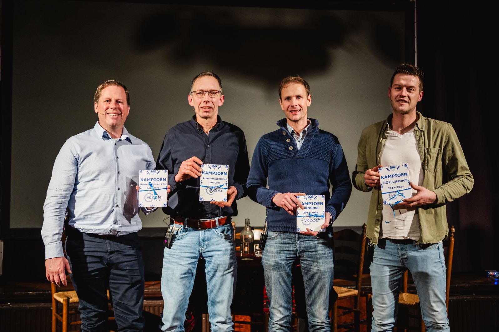 Melkveehouders André de Groot, Mark Ormel, Boudewijn Krabben en Jeroen Beker spanden vorige week tijdens de jubileumbijeenkomst van Vruchtbare Kringloop Oost (VK-Oost) de kroon. De vier leden scoren bovengemiddeld goed op het gebied van stikstofbodemoverschot, ammoniak- en broeikasgasemissie. Ze lichtten toe hoe ze dat voor elkaar krijgen.