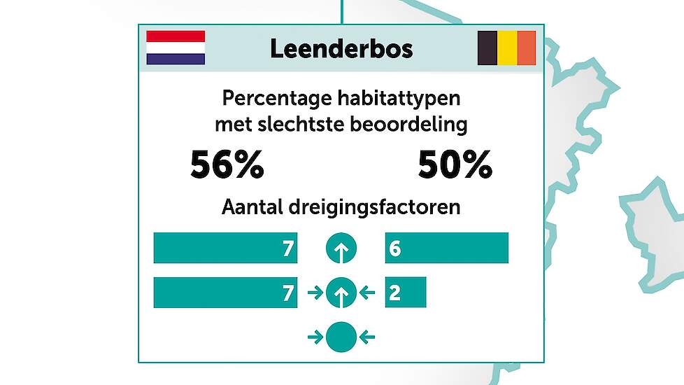 In België ligt dat net iets anders. In het gebied Brabantse Wal ziet België stikstof ook als een bedreiging met de classificatie ‘hoog’. In Leenderbos, Groote Heide & Plateaux krijgt stikstof de classificatie ‘midden’ en in Zwin & Kievitspolder ziet België stikstof niet als een bedreiging.